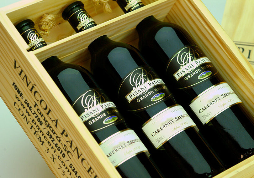 Na foto, garrafa de Cabernet Sauvignon safra 2003 e a caixa de acondicionamento do produto. As embalagens eram escolhidas primando pela diferenciação.Lançamento do primeiro Grande Reserva Panceri, varietal Cabernet Sauvignon, safra 2002.